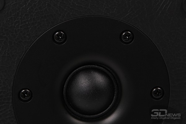 Прежде чем взяться за исследование внутреннего устройства колонки с помощью отвёртки, хотелось бы обратить ваше внимание на расположение высокочастотного и широкополосного динамиков относительно друг друга. Накладное декоративное крепление последнего частично перекрывает фланец твитера. Максимально близкое расположение динамиков позволяет добиться «точечного» эффекта излучения при уменьшении перекрёстного воздействия динамиков для более чёткого воспроизведения средних и высоких частот.