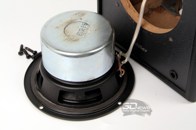 Отвинчиваем крепёж и аккуратно снимаем нижний динамик. В системе Edifier R1900TII шестой версии для воспроизведения средних и низких частот используется излучатель действительно оригинальной конструкции, сделанный по технологии компании ScanSpeak. Особенность этого динамика в том, что его 5-дюймовый диффузор изготовлен из прессованной бумаги с добавлением шерсти. Кроме того, на снимке ниже обратите внимание на специфические диагонально-«солнцеворотные» полосы на диффузоре: всё это в комплексе призвано максимальным образом увеличить жёсткость излучающей плоскости.