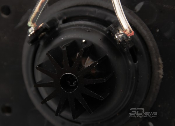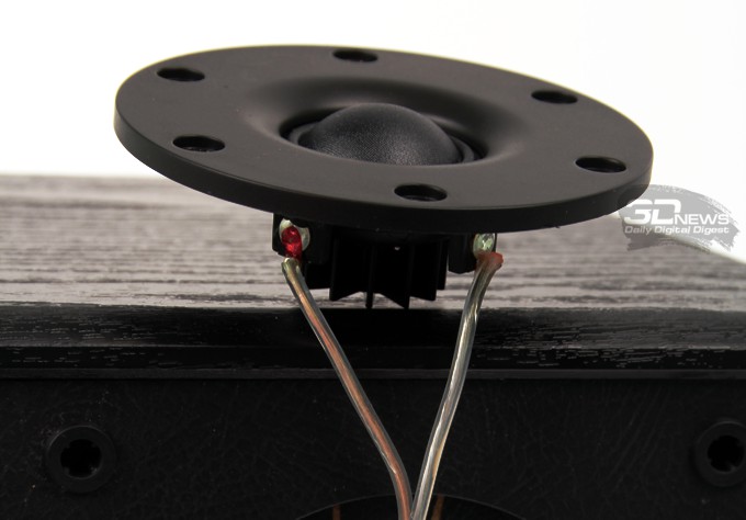 Именно из-за этой жёсткости низкочастотный диапазон начинается только с 46 Гц, но зато такое исполнение позволяет значительным образом избавиться от резонансных пиков на «изломных» участках АЧХ. Сопротивление динамика составляет 6 Ом.
