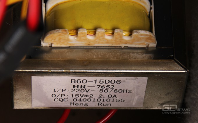 Трансформатор системы намотан на классические ш-образные пластины, на выходе две обмотки по 15 В на ток до 2 А. То есть даже при самом настойчивом желании трансформатор спалить будет нелегко, разве что умудриться устроить КЗ.