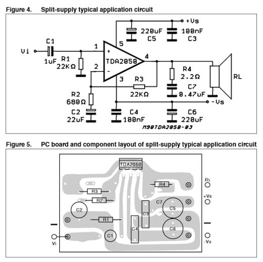 Вот так выглядит стандартная схема включения TDA2050: