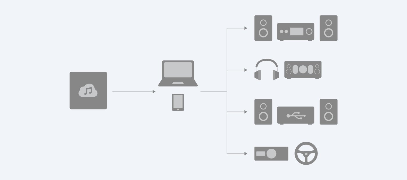 Приобретайте музыку в формате аудио высокого разрешения через музыкальные онлайн-сервисы с компьютера, смартфонов и планшетов и транслируйте файлы на домашнюю аудиосистему или портативное устройство для воспроизведения музыки. Также можно подключать устройства с помощью кабеля USB к домашней или автомобильной аудиосистеме и наслаждаться прослушиванием музыки в любом месте.