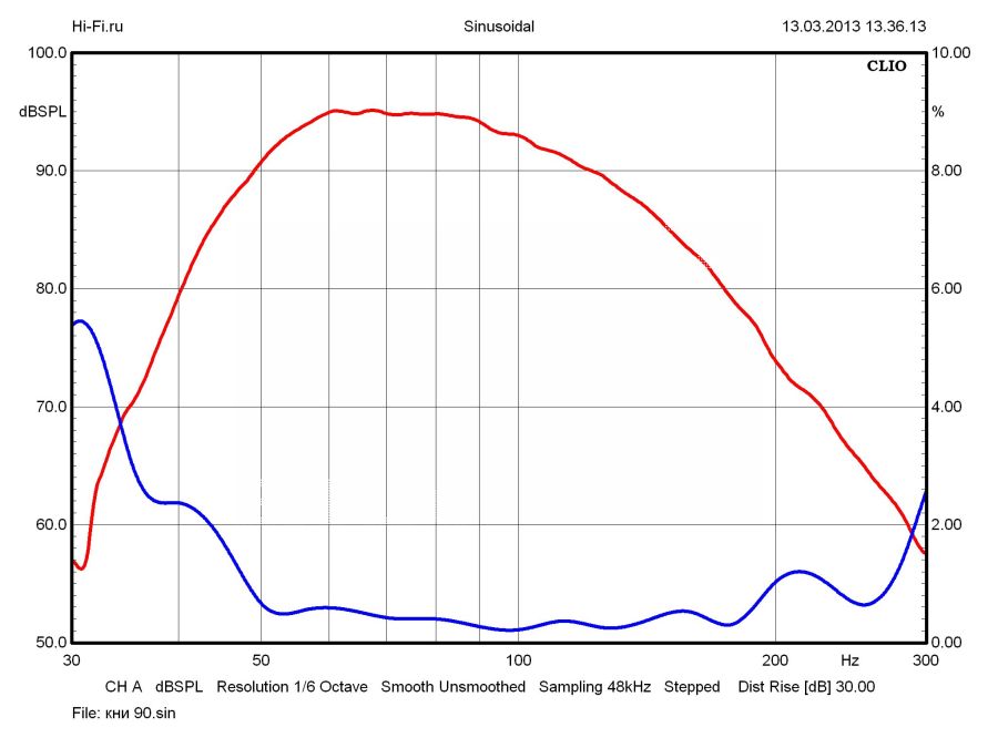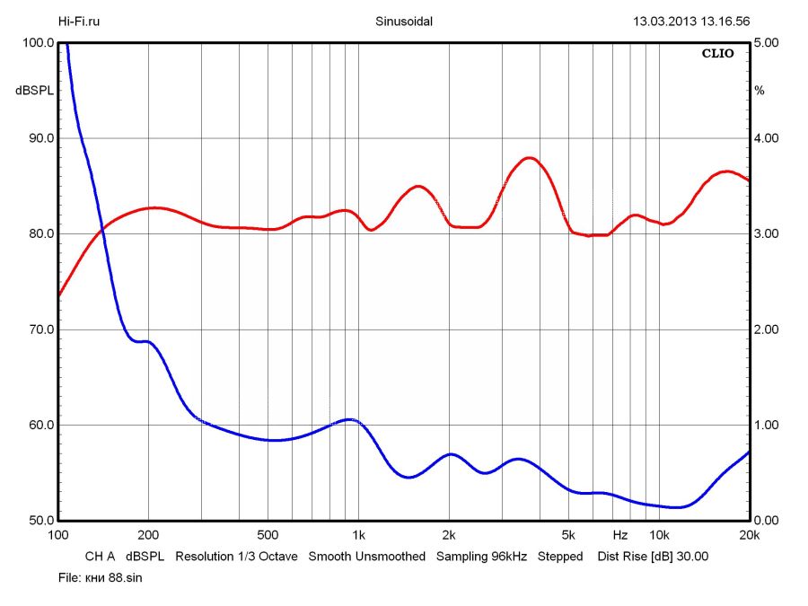 Акустический комплект Edifier S730 имеет в своем составе полноразмерный сабвуфер, что является большой редкостью для подобной техники, а среди протестированных нами моделей, пожалуй, встречается впервые. Под полноразмерностью мы понимаем не столько массогабаритные показатели, сколько качественные признаки, соответствующие понятию «бас-машина». И в данном случае исследуемый компонент всецело отвечает предъявляемым требованиям. Частотная характеристика охватывает две верхние октавы НЧ-диапазона, демонстрируя весьма продолжительный участок с равномерной чувствительностью (рис. 2). Но и в первой октаве, несмотря на достаточно интенсивный спад, следует ожидать частичной работоспособности, по крайней мере начиная с 30 Гц. Залогом этого служит малый прирост нелинейных искажений в указанной области даже при высоком уровне сигнала. На фоне приведенных характеристик возможности комплектных сателлитов выглядят несколько слабее: им присущи и повышенная неравномерность на высоких частотах, и ограниченный динамический диапазон. На рис. 2 синим цветом показан КНИ при звуковом давлении 88 дБ на 1 м.