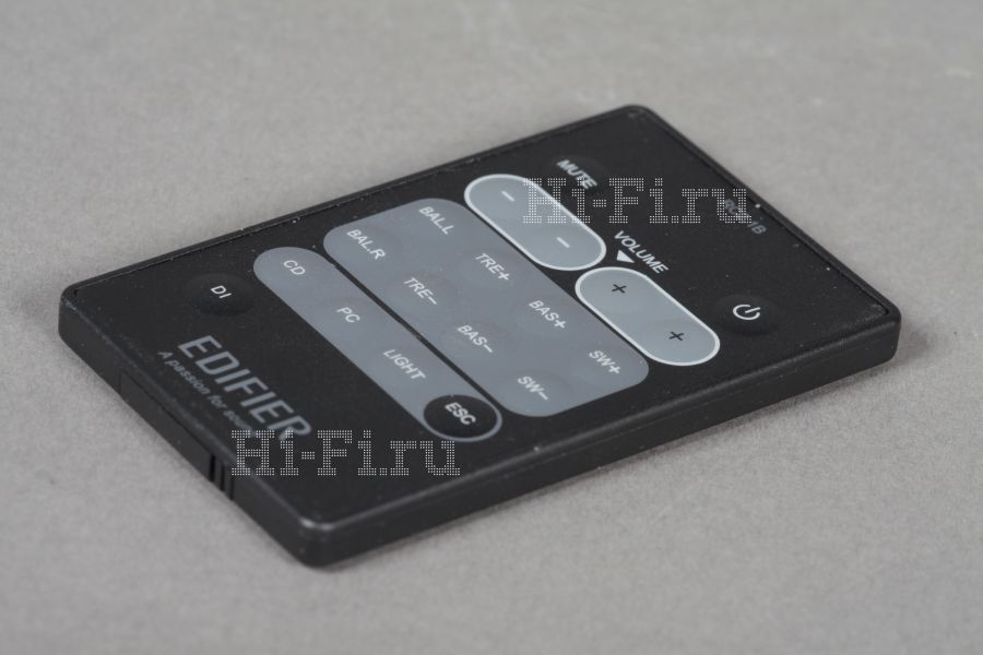 Пультов ДУ два, проводной и беспроводной. Первый оснащен барабанным регулятором, который контролирует громкость, тембры и баланс каналов. Поворот рукоятки изменяет значение параметров, нажатие на нее переключает режимы регулировки. Все очень удобно и интуитивно понятно. Индикацию обеспечивает крупный бело-синий дисплей с подсветкой, чью интенсивность можно менять. Здесь же удачно смонтирован разъем для наушников. Пульт укомплектован подставкой для вертикальной установки; горизонтальная тоже возможна, но ЖК-экран обладает не слишком широкими углами обзора, поэтому такой вариант не рекомендуется. Провод от пульта идет на сабвуфер, имеет нестандартный разъем и не отличается избыточной длиной. Второй пульт ДУ беспроводной, сделан без изысков, компактен, к удобству работы с ним вопросов нет.