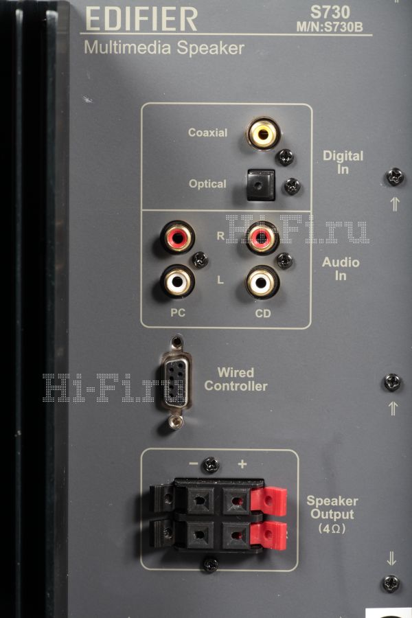 Для связи с источником звука предназначены два аналоговых стереовхода на разъемах RCA и оптический и коаксиальный цифровые порты S/PDIF. То есть у Edifier S730 имеется встроенный ЦАП, что поможет улучшить звучание большинства аудиокарт, особенно из числа интегрированных в материнские платы.