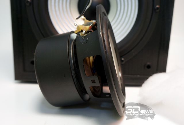 Широкополосный динамик. Качественный, мощный магнит плюс магнитное экранирование, пайка слегка небрежная, зато клея — от души. Особо прошу обратить внимание на "гнездо", в котором сидит широкополосник: специальная бочкообразная пластиковая вставка чуть шире диаметра диффузора, со вклеенным "дном" из фанеры — такая "изоляция" среднечастотного динамика явно необходима для формирования определённой, задуманной разработчиками АЧХ.