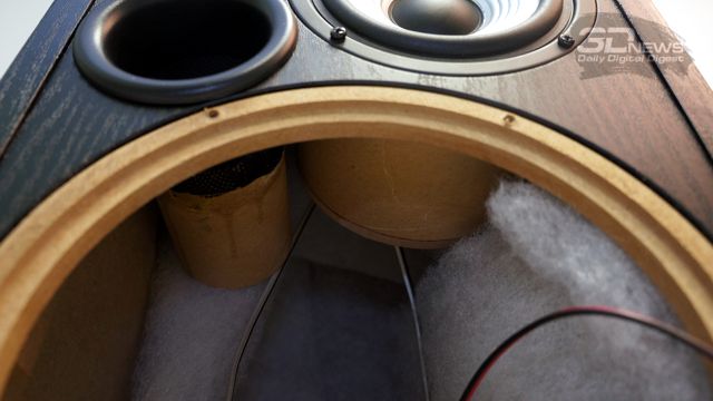 Для особо интересующихся акустической схемой мы сделали ещё один снимок, наглядно показывающий габариты "гнезда" среднечастотника, размеры и форму фазоинвертора: