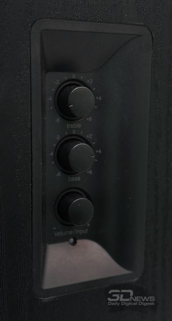 Темброблок — самая спорная часть конструкции колонок Edifier R2700. Точнее, спорной является его реализация. Нулевые уровни регулировки нижних и высоких частот показались нам выбранными очень, очень условно. Но подробнее об этом ниже, в части с впечатлениями о звуке.