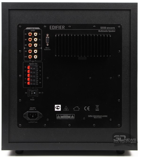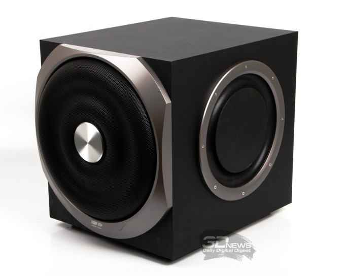 Сабвуфер системы Edifier S550 Encore по традиции объединяет в себе интегрированный блок питания, коммутационные и усилительные цепи. Гигантский «почти куб» (глубина корпуса слегка превышает высоту и ширину) армирован с фронтальной плоскости мощной несъёмной решёткой, повторяющей форму динамика. В свою очередь, решетка декорирована дополнительной пластиковой фальшпанелью серебристого цвета. Прорезиненные диффузоры пассивных излучателей расположены по бокам сабвуфера и декоративным покрытием не оснащаются.