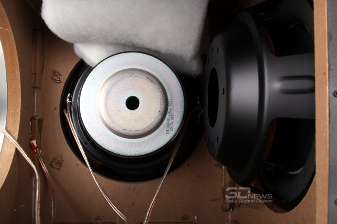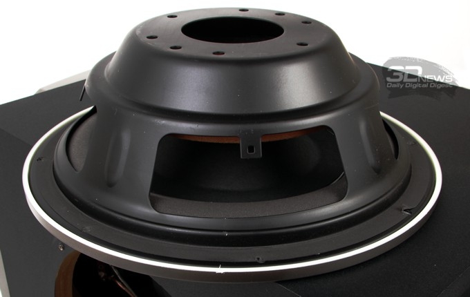 Рассмотрим со всех сторон пассивный излучатель, а заодно заглянем внутрь сабвуфера. Конструкция и расположение излучателей идентичны тому, что мы наблюдали внутри сабвуфера системы S730: корпус из мощной плиты MDF, «барабанные перепонки» пассивных излучателей, огромный низкочастотный динамик с вентиляционным отверстием в магнитной системе для защиты от перегрева и с широким подвесом для значительной амплитуды линейного хода (ему приходится раскачивать не только свой диффузор, но и пассивные излучатели в замкнутой конструкции без фазоинвертора).