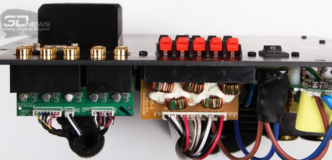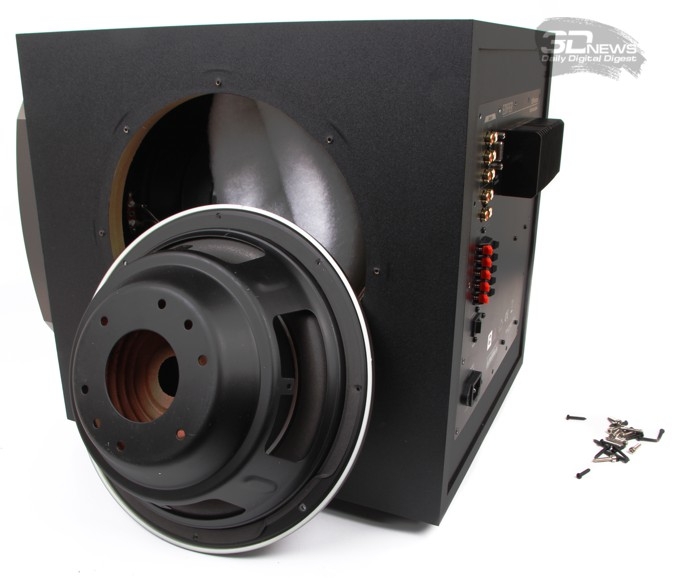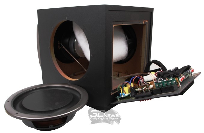 В случае с сабвуфером каждая из двух обмоток низкочастотного динамика подключена к своему усилительному каналу с мостовой схемой включения. Благодаря высокому КПД усилителей, конструкторам системы удалось обойтись небольшим компактным радиатором, которого тем не менее вполне достаточно для отвода тепла от всех оконечных усилителей.