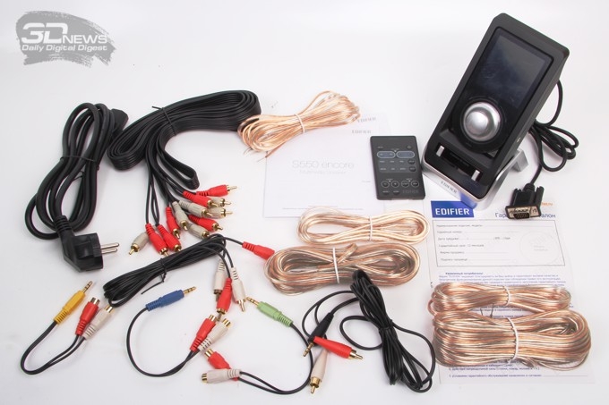 Комплект поставки системы Edifier S550 Encore включает четыре одинаковых сателлита (два тыловых и два фронтальных), колонку центрального канала, сабвуфер (из отдельной упаковки), два пульта дистанционного управления — беспроводной ИК и проводной с ЖК-дисплеем и подставкой, кабели для подключения сателлитов, комплект различных кабелей для подключения источников сигнала, силовой кабель питания, инструкции и гарантийный талон. Вот так вся эта радость выглядит на групповом семейном фото:
