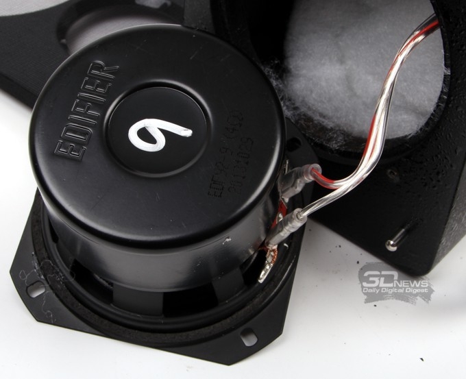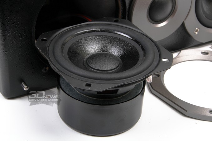 Каждый из четырёх сателлитов тыловых и фронтальных каналов имеет двухполосную конструкцию на базе 3,5-дюймового среднечастотника и 1-дюймового твитера, оба с магнитным экранированием. Вот такая компактная конструкция высотой 20 см «раскачивает» до 60 Вт. Твитер из клеёной конструкции корпуса колонки выдирать не будем, мы не вандалы, тем более что его шёлковый купол вполне виден снаружи, а лучистую структуру рёбер магнитной системы все неоднократно имели возможность наблюдать в наших предыдущих обзорах полочной мультимедийной акустики Edifier.