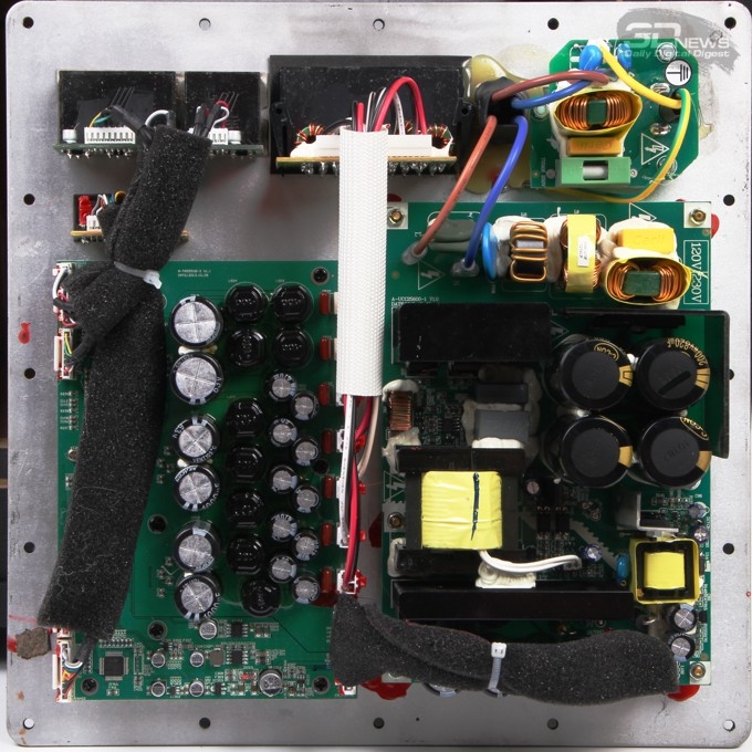 Изнутри на этой же металлической пластине размещена вся электроника, включая цепи выпрямления и стабилизации высокоэффективного импульсного 600-Вт блока питания с низким потреблением в ждущем режиме, а также цифровые декодеры, цифровой усилитель, служебные и сигнальные разъёмы.
